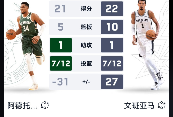 首节中段,场上出现了揪心的一幕,文班亚马被撞到,手捂膝盖,随后被换下场。首节上半段,马刺的三分准的没朋友,5中4,只三分就得到12分。首节比分马刺31-27领先4分,字母哥表现不俗,单节得到14分。